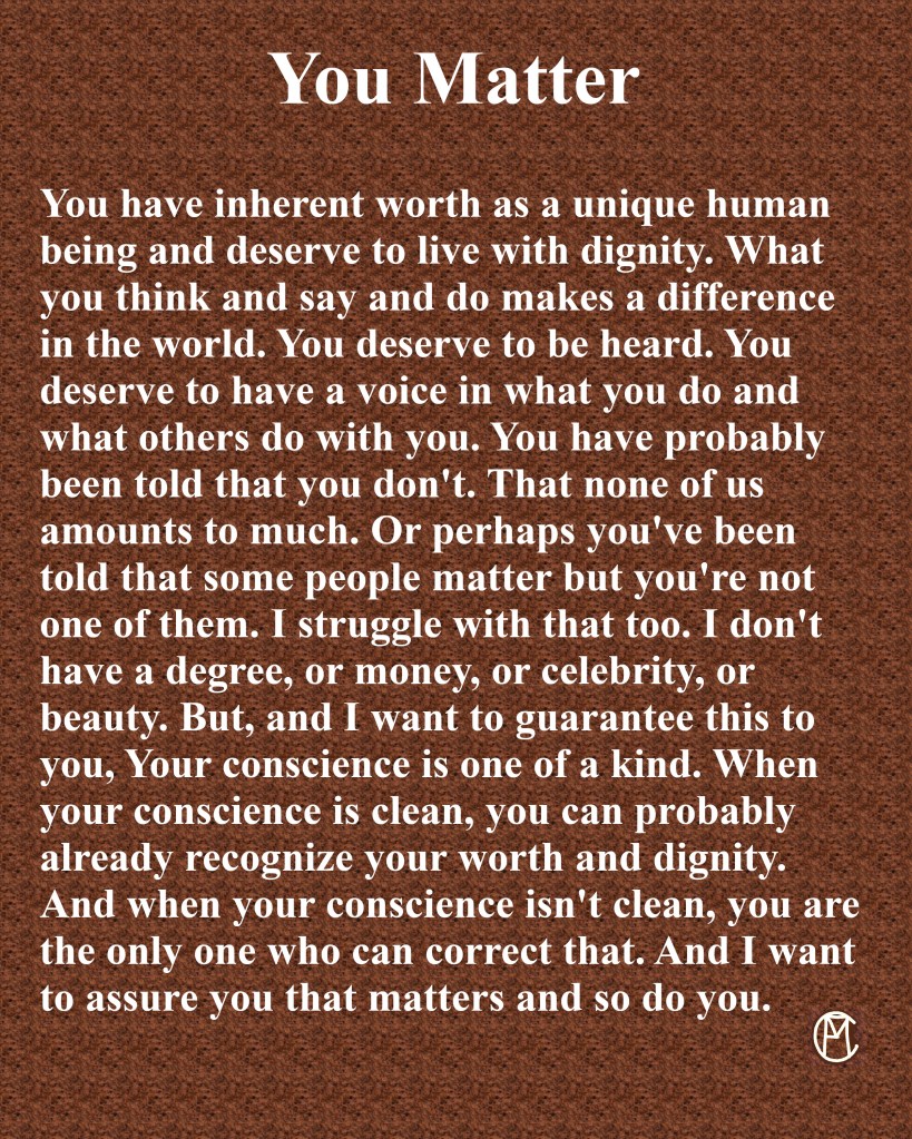 You have inherent worth as a unique human being and deserve to live with dignity. What you think, and say and do makes a difference in the world. You deserve to be heard. You deserve to have a voice in what you do and what others do with you. You have probably been told that you don’t. That none of us amounts to much. Or perhaps you’ve been told that some people matter but you’re not one of them. I struggle with that too. I don’t have a degree, or money, or celebrity, or beauty. But, and I want to guarantee this to you, Your conscience is one of a kind. When your conscience is clean you can probably already recognize that worth and dignity. And when your conscience isn’t clean you are the only one who can correct that. And I want to assure you that matters and so do you.