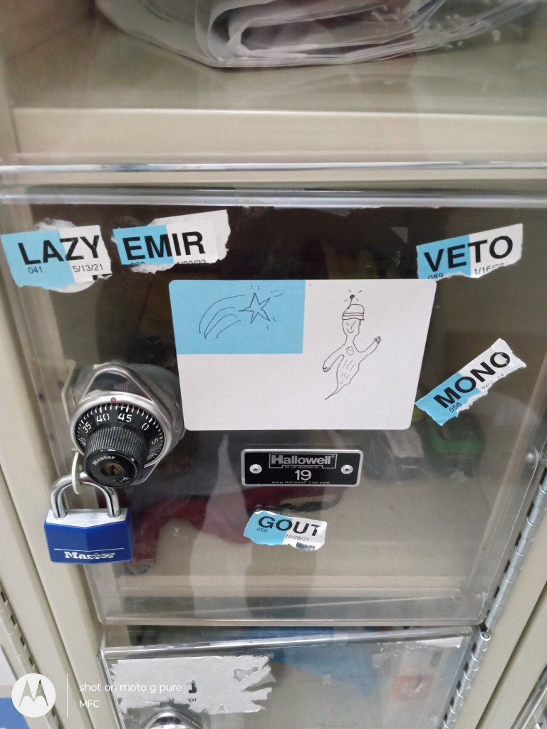 A long time ago I realized that the willingness to work evenings and weekends was an adaptive trait in a capitalist economy. I have never gone to the bars on the weekend and have rarely felt the need to just leave town to blow off steam. So I’m spending another Saturday night at Walgreens. Over the years I’ve decorated my locker with fragments from order stickers. We got a sheet of completely blank ones on Wednesday. Today I decorated it with markezuma. He’s not very detailed but my locker is definitely even more personalized now. Do some art and have an awesome weekend.