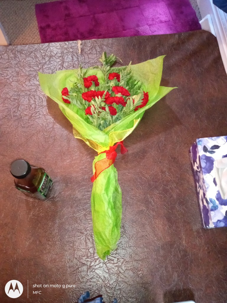 My wife knows I love carnations. She bought me this bouquet last week. She warned me that if I didn’t take them out of the wrapping and put them into water that they wouldn’t last long. I left them in the wrapping and hung the whole arrangement on the wall of the den. She was of course correct. They became droopy in only a few days and I had to take the whole thing down. It’s still beautiful even though it can’t be upright any longer. Life is like that sometimes. The things we put on a pedestal fade so quickly. Regardless I think carnations are awesome. I hope you have beauty in your day.