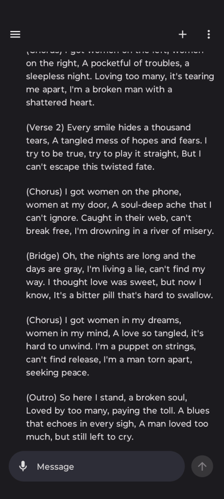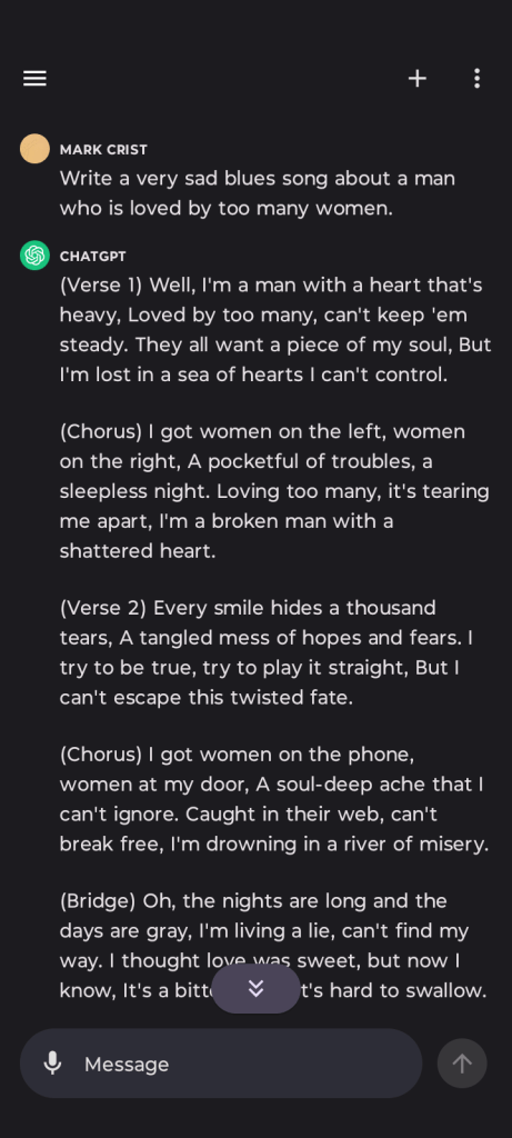 A few minutes ago I asked ChatGPT to write a blues song for me. This is the result.