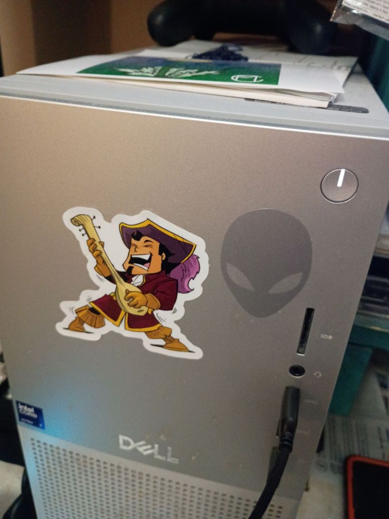 I replaced my old gaming headset today. It is an Alienware creation. The buttons and dials are all in the wrong places. It’s got unnecessary lights. The headpiece has a strap, so it fits all heads, but it looks goofy. Still it’s functional and should last for a while. The funniest thing is that it came with a little gray alien sticker which I can barely see but apparently photographs well. Anyway, new tech. Yay!